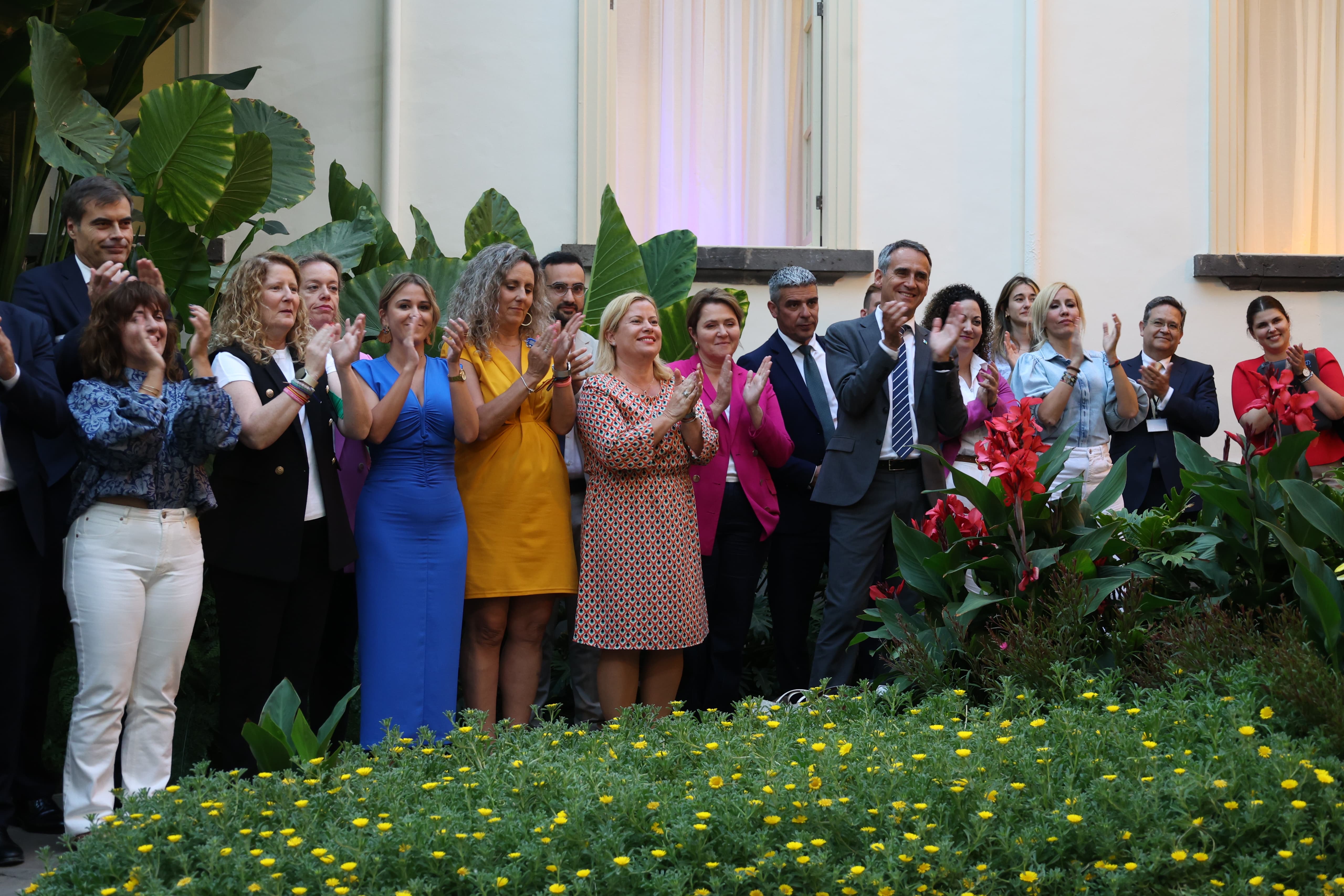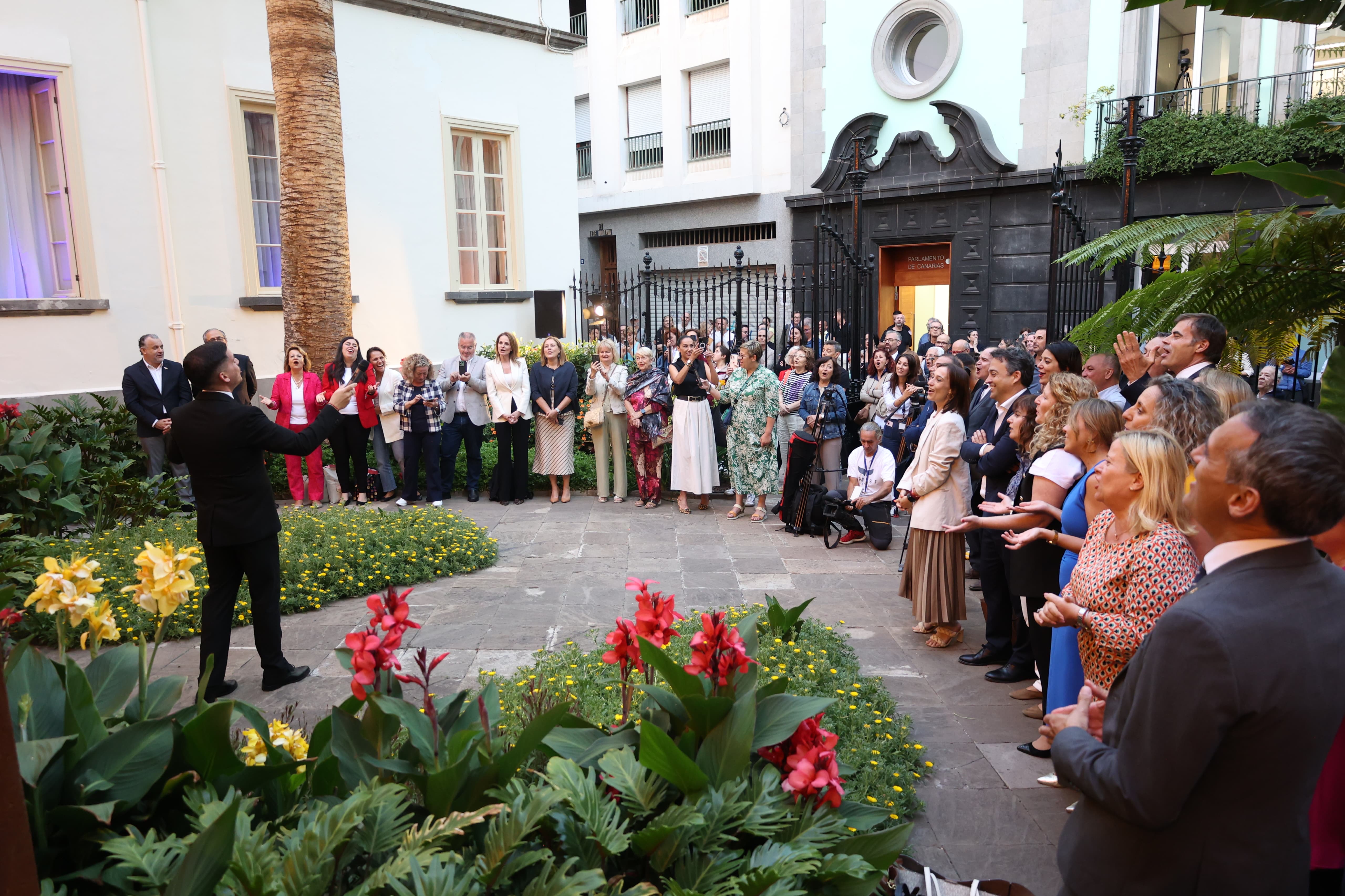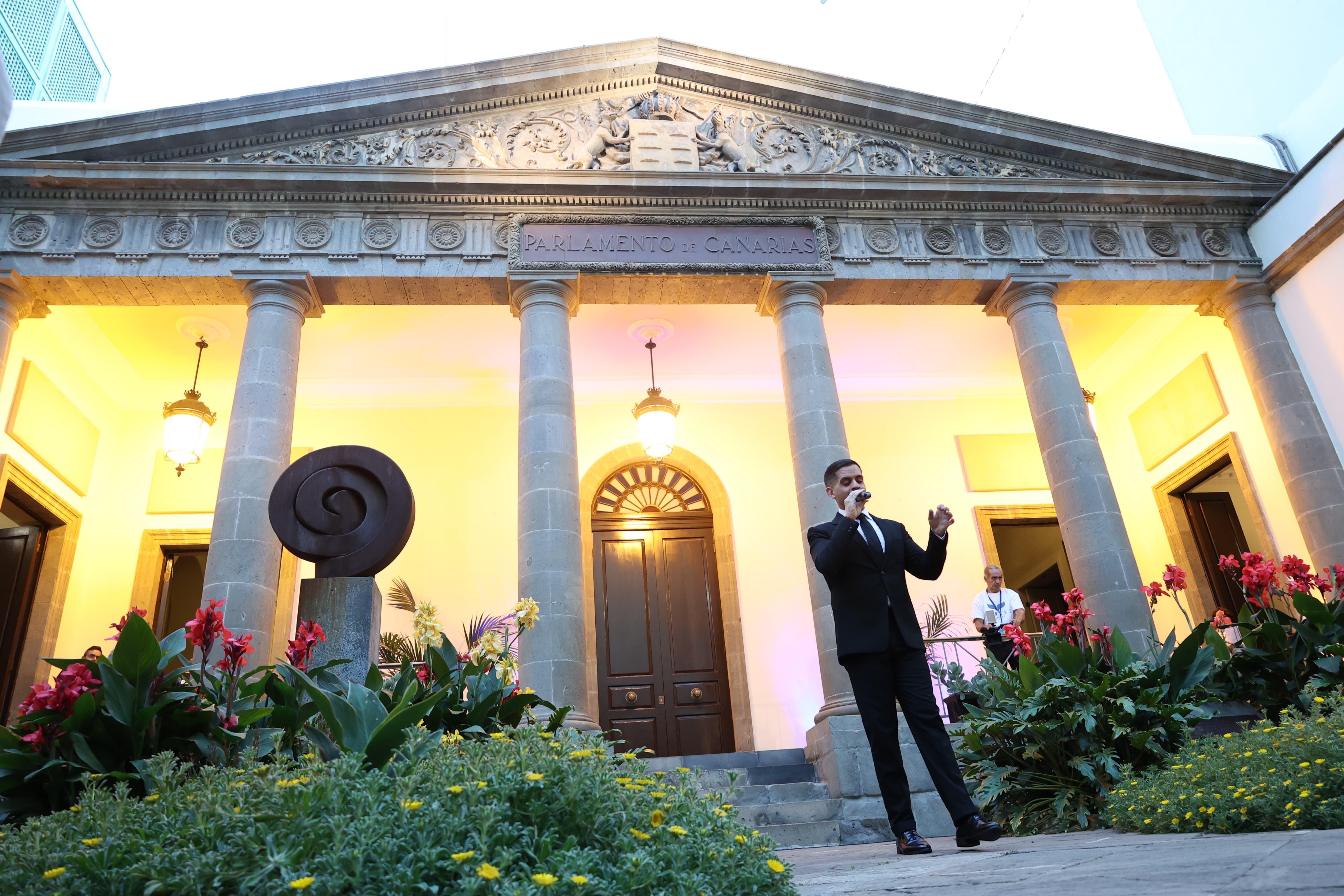 La presidenta del Parlamento de Canarias, Astrid Pérez, ha inaugurado en la noche de este martes la iluminación en la fachada de la Cámara para conmemorar el Día de Canarias. Los colores de la bandera de las islas se mantendrán en la sede parlamentaria hasta el próximo domingo. El acto del encendido ha estado acompañado por la voz del tenor tinerfeño, Besay Pérez, un artista vinculado al folclore de nuestras islas y a las rondallas del carnaval de Santa Cruz de Tenerife. El cantante hizo un recorrido por las canciones más representativas de nuestro folclore en un concierto abierto al público que contó con la asistencia de los diputados y diputadas de la Cámara, así como vecinos y vecinas que se acercaron hasta el Patio de Honor de la institución parlamentaria.