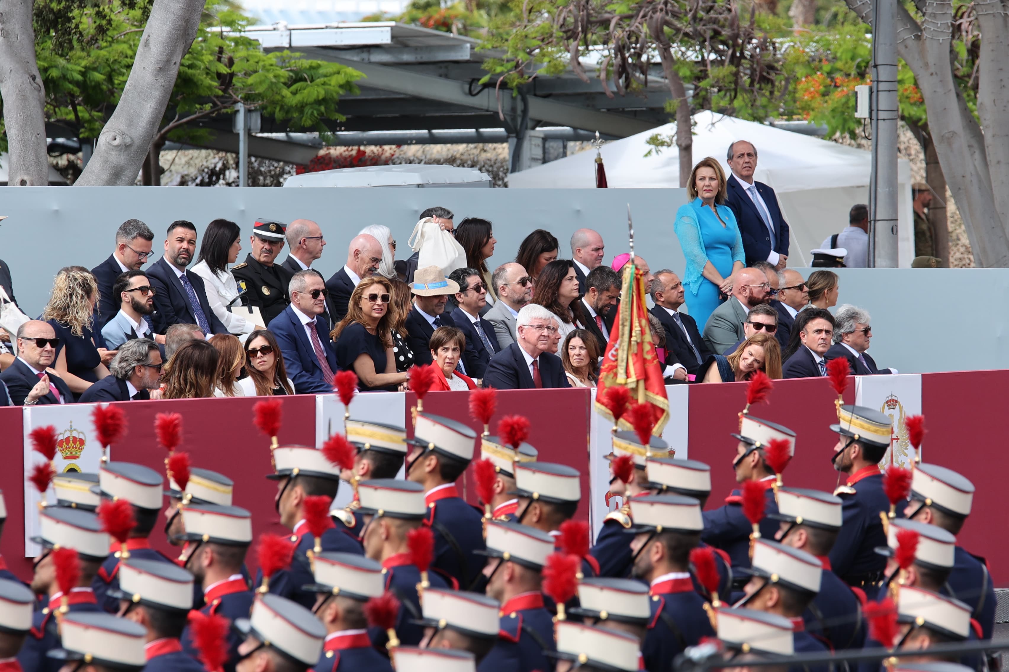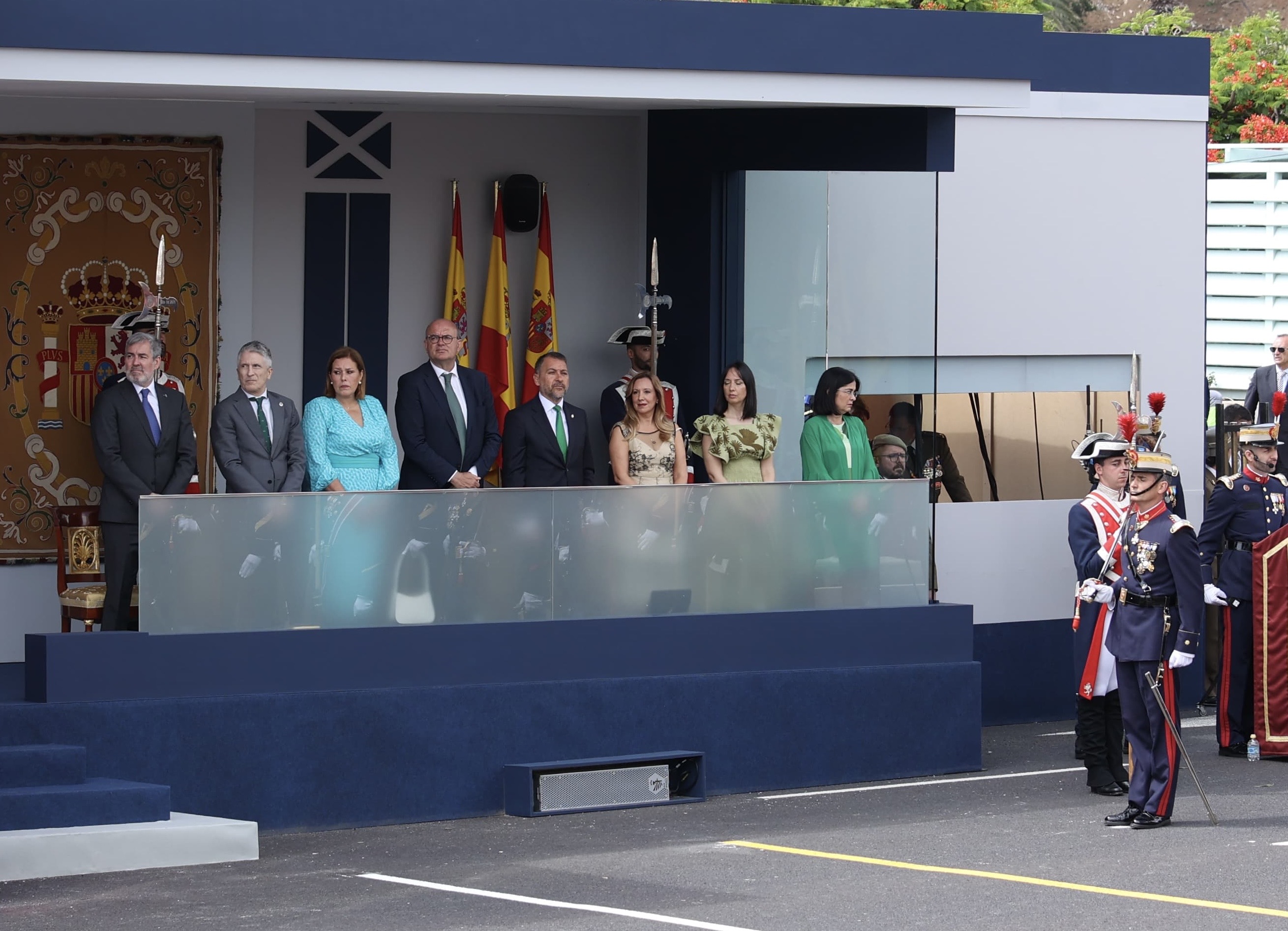 La presidenta del Parlamento de Canarias, Astrid Pérez, asistió este sábado en Santa Cruz de Tenerife al Desfile de las Fuerzas Armadas 2025 con la presencia de Sus Majestades los Reyes. 3.266 integrantes de los tres ejércitos, la UME, la Guardia Real y la Guardia Civil han desfilado en la capital tinerfeña. “Es un honor que seamos el lugar elegido para celebrar este importante acto. Se trata de la segunda vez en la historia que se realiza en la isla de Tenerife, después de que en 1986 también se celebrara aquí, con SM el Rey, entonces príncipe de Asturias, desfilando como caballero cadete de la Academia General. La tercera vez que Canarias acoge el Día de las Fuerzas Armadas”, ha destacado la presidenta Astrid Pérez, quien ha felicitado y reconocido la labor de todas las personas que forman parte de nuestras Fuerzas Armadas en su día.