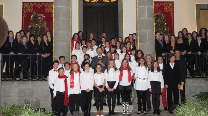 El presidente del Parlamento, Antonio Castro, con los coros del Conservatorio Profesional de Música de Santa Cruz de Tenerife.