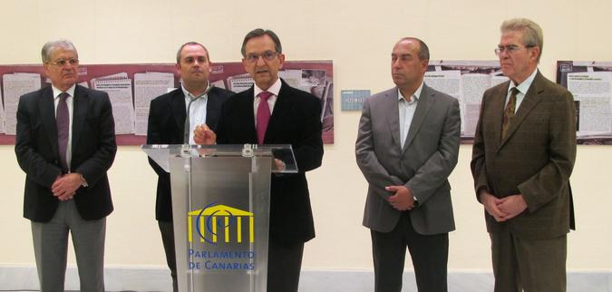 Los miembros de la Mesa del Parlamento junto al coordinador de la exposición, Jaime Coello.