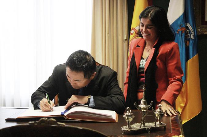 Koshikawa firma en el Libro de Honor del Parlamento de Canarias.