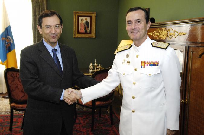 El Presidente del Parlamento, Antonio Castro, saluda al Jefe del Mando Naval, Carlos Luis Tortosa.