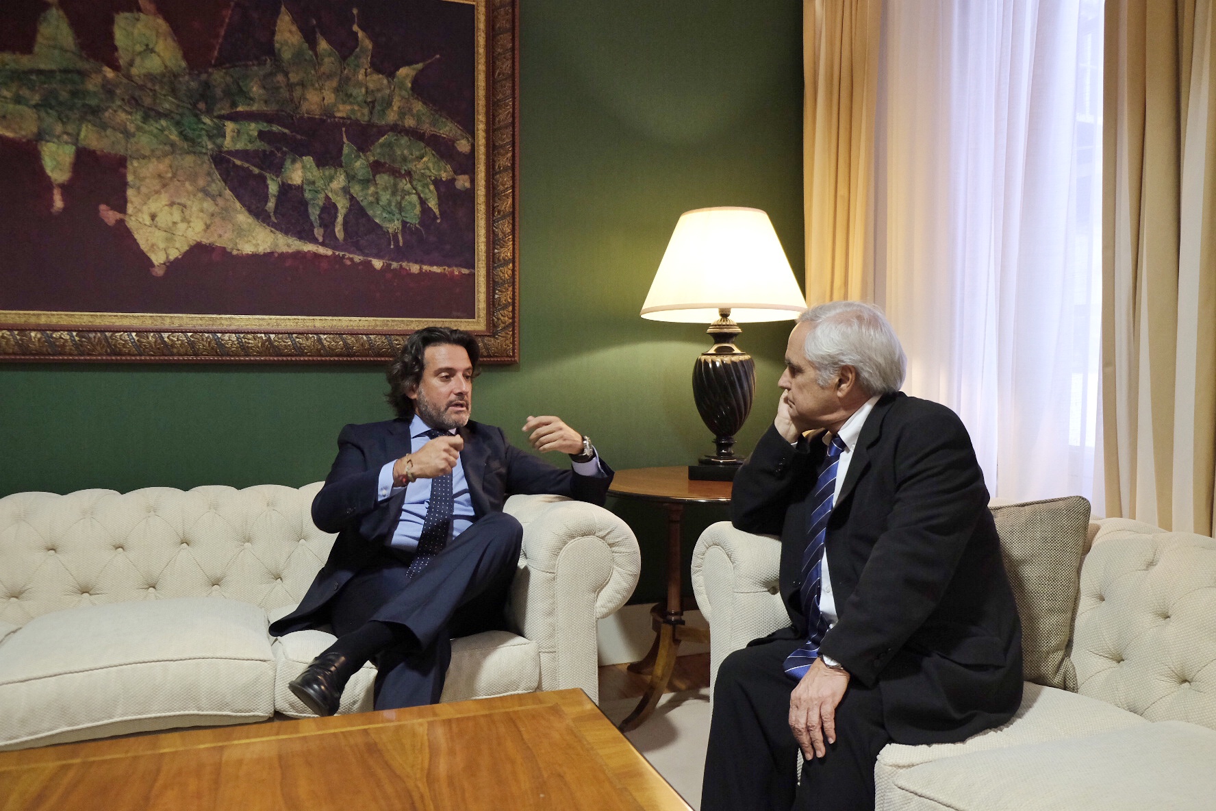 Canarias, 30 de octubre de 2019.- El presidente del Parlamento de Canarias, Gustavo Matos, recibió al periodista Juan Cruz tras su reciente nombramiento como presidente del Consejo Social de la Universidad de La Laguna (ULL). En el encuentro, Matos le deseó todos los éxitos y aciertos al también Premio Canarias de Comunicación, de quien destacó su prestigiosa trayectoria y su calidad humana. Los dos abogaron por estrechar la colaboración entre la Cámara legislativa y la Universidad, en el marco de la apuesta del presidente Matos por acercar la institución a la ciudadanía y abrirla a todos los sectores de la sociedad.