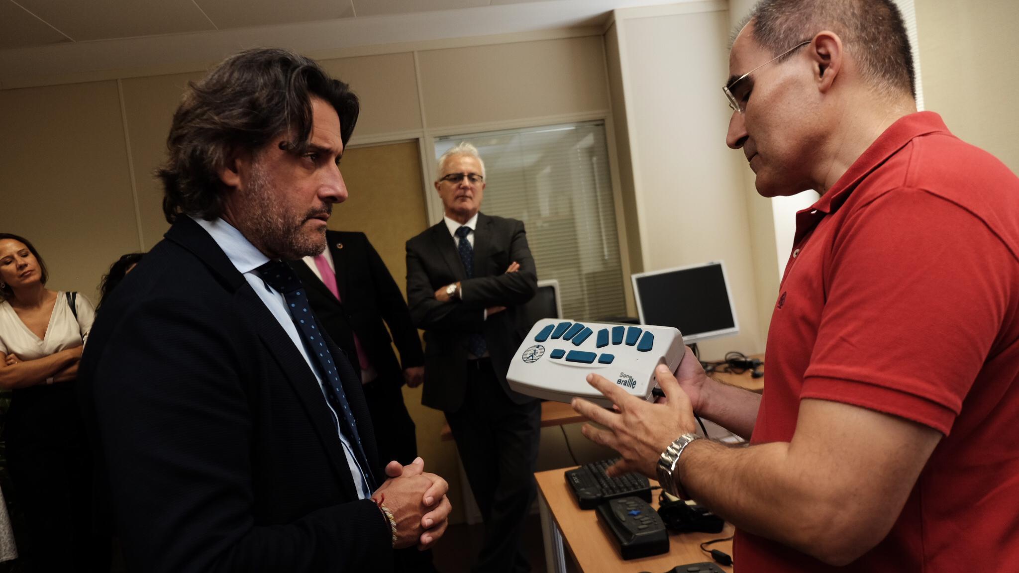En la visita a la sede de la ONCE, el presidente recibió una explicación detallada del recorrido que una persona realiza hasta llegar a la organización y afiliarse. La biblioteca, la sala de tecnología de la comunicación o los sistemas de lectoescritura fueron algunos de los servicios que conoció.