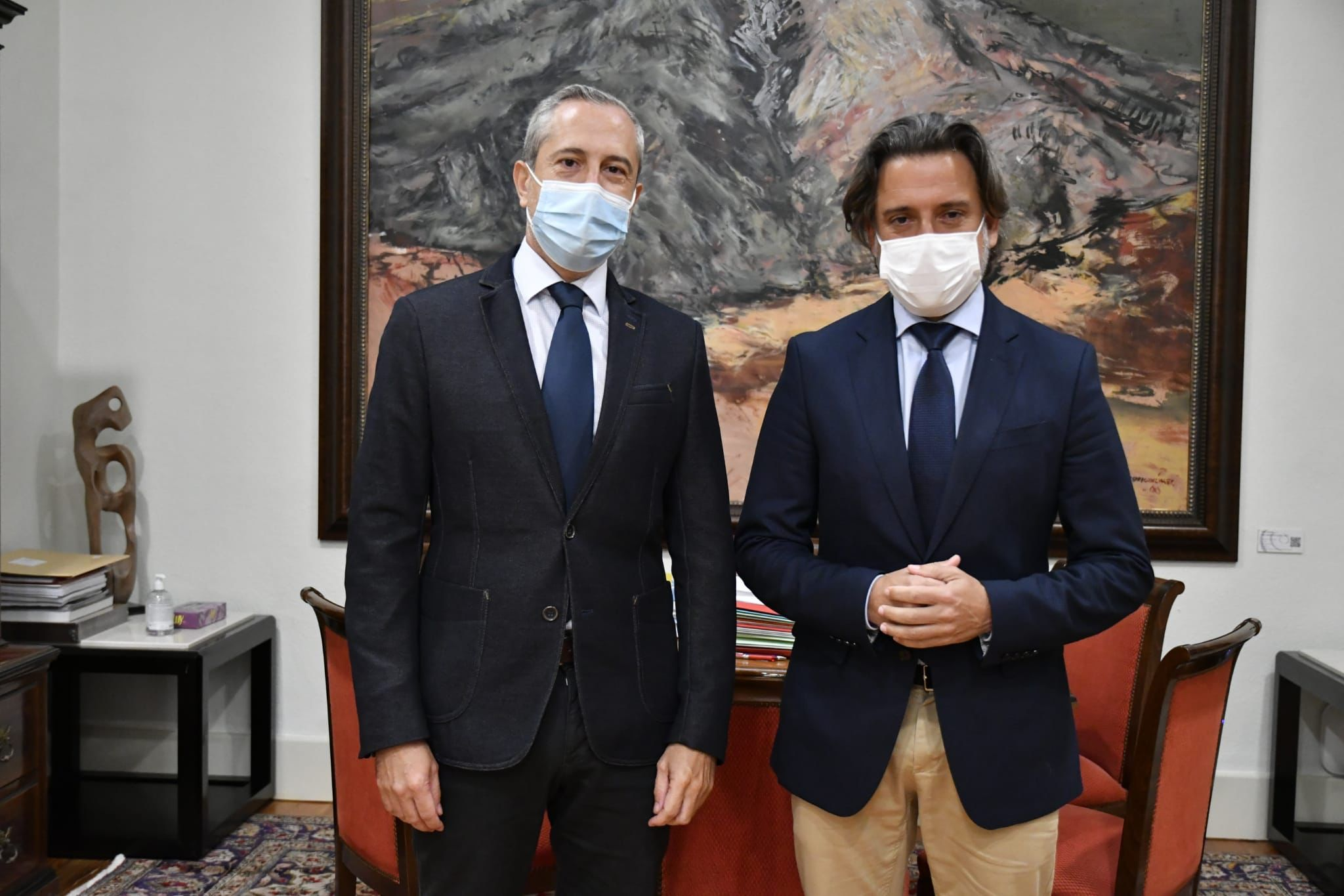 Canarias, 22 de febrero de 2022.- El presidente del Parlamento de Canarias, Gustavo Matos, recibió este martes al presidente del Círculo de Bellas Artes de Tenerife, Alejandro Tosco, para abordar la propuesta de uso de la sala de exposiciones de la Cámara por la entidad cultural durante el tiempo en que esta permanezca en obras. La sede del Círculo está siendo objeto de un proyecto de reforma y adaptación, de tal forma que su espacio expositivo permanece cerrado. El objeto del acuerdo con el Parlamento es la cesión en momentos puntuales de la Sala Estatuto de Autonomía para que la entidad cultural pueda retomar la actividad de exposiciones. Matos destaca la importancia del Círculo de Bellas Artes en los ámbitos histórico, cultural y social, tanto para Santa Cruz como para Tenerife y el resto del archipiélago.