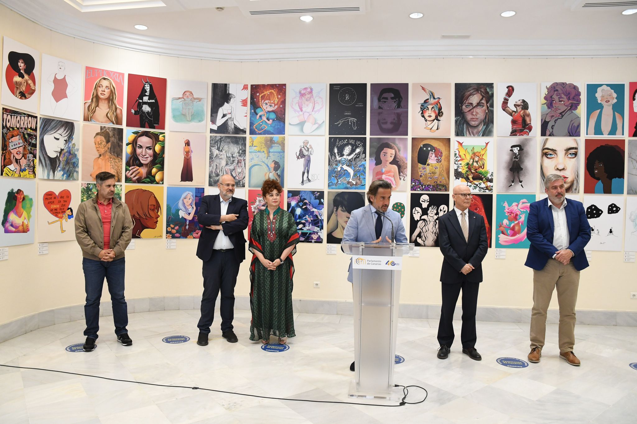 Canarias, 6 de mayo de 2022.- El Parlamento de Canarias alberga desde hoy la segunda edición de ‘Ilustradoras&Ilustradas”, exposición colectiva que reúne obras de mujeres artistas en más de cien paneles. En el acto de inauguración, el presidente de la Cámara, Gustavo Matos, puso en valor la enorme calidad de cada una de estas obras y subrayó que la historia “ha ocultado, injustamente, esa mirada sorprendente, rica y variada de las mujeres artistas”.