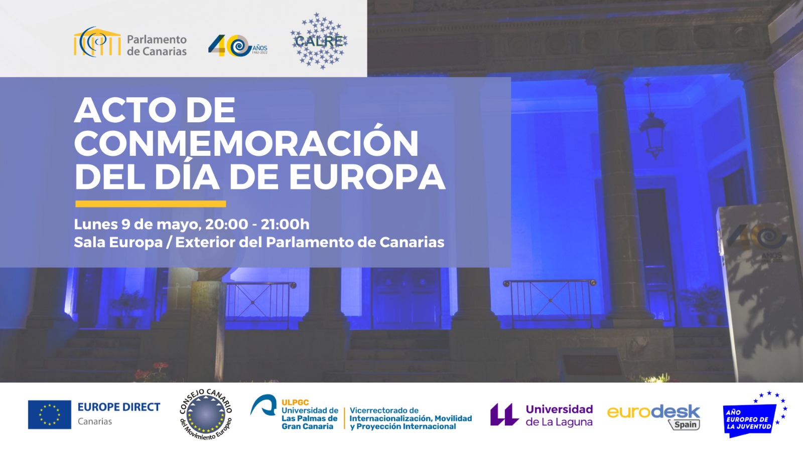 El Parlamento de Canarias acoge el próximo lunes, 9 de mayo, el acto de conmemoración del Día de Europa. Tendrá lugar a las 20:00 horas en la Sala Europa e intervendrán el presidente de la Cámara, Gustavo Matos, el viceconsejero de Economía e Internacionalización del Gobierno de Canarias, Blas Acosta, el presidente del Cabildo de Tenerife, Pedro Martín, el alcalde de Santa Cruz de Tenerife, José Manuel Bermúdez, la vicerrectora de Internacionalización de la ULL, Lidia Cabrera, y el presidente del CCME, Manuel Medina. También intervendrá una niña en representación de las Escuelas Embajadoras Europeas y un joven europeísta del Consejo Canario del Movimiento Europeo. El acto contará con una actuación musical de Barrios Orquestados y, al finalizar, se iluminará la fachada principal del Parlamento con la proyección de la bandera de Europa mientras Barrios Orquestados interpreta una pieza musical.
