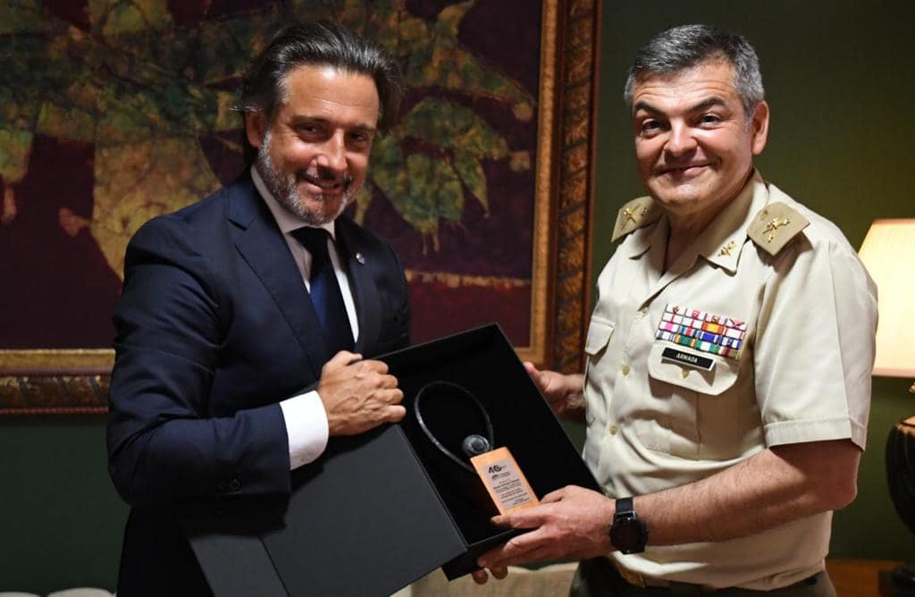 Canarias, 7 de junio de 2022.- El presidente del Parlamento de Canarias, Gustavo Matos, recibió este martes la visita del general Ramón Armada Vázquez, jefe de la Brigada Canarias XVI y comandante militar de Las Palmas. Armada regresó el pasado 30 de mayo a España tras permanecer de misión en Líbano en el contingente liderado por la Brigada Canarias XVI, brigada que ha retomado en esta misión el Programa Cervantes, cursos de español que los militares imparten en colegios y centros culturales del sur del Líbano durante su tiempo libre. Matos expresa el reconocimiento y cariño de la Cámara a las Fuerzas Armadas por la importante labor que desarrollan dentro y fuera del territorio nacional.