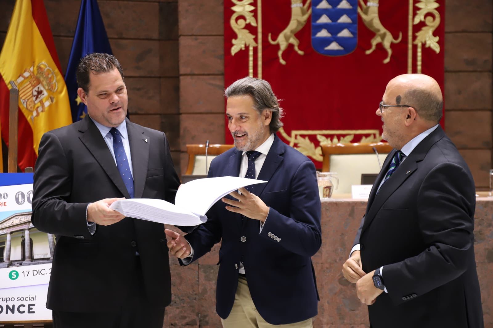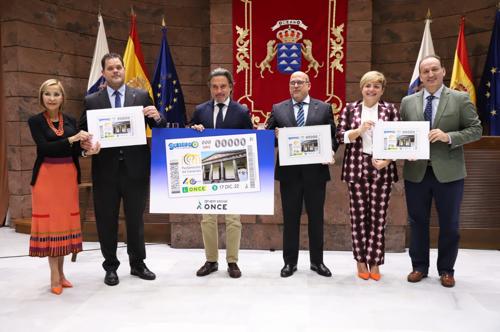 Canarias, 12 de diciembre de 2022.- El Parlamento de Canarias acogió este lunes la presentación del cupón de la ONCE dedicado al 40 aniversario de la Cámara. La imagen de la histórica fachada del edificio del Parlamento, lucirá en uno de los cupones de la organización el próximo sábado, 17 de diciembre. “Hoy es un día muy especial para el Parlamento canario, ya que, en paralelo a la ONCE, cumplimos cuatro décadas de autonomía. Este cupón es para nosotros símbolo de la colaboración del poder legislativo y los colectivos sociales. La ONCE es referente internacional, con una labor ejemplar, trabajando y avanzando de la mano de la democracia durante estos 40 años”, expresó el presidente del Parlamento de Canarias, Gustavo Matos. “Es muy importante el apoyo público para poner sobre la mesa medidas que igualen las oportunidades de las personas. Cada vez que conseguimos escalar un peldaño en la escalera de la igualdad, toda la sociedad sube junta ese peldaño”, añadió Matos. Por su parte, el delegado territorial de la ONCE en Canarias, José Antonio López Mármol, manifestó que “en la ONCE hemos tenido un recorrido similar al del Parlamento canario; en 1982 celebramos nuestras primeras elecciones democráticas. Desde entonces hemos luchado por sacar adelante una organización para la vida inclusiva y digna de las personas ciegas”. Miguel Ángel Déniz Méndez, presidente del consejo territorial de la ONCE en Canarias, recordó que la Cámara ostenta el premio Bastón Blanco desde 1995. “Hemos evolucionado juntos, y, el parlamento, a través de sus leyes, ha mejorado la vida de la sociedad y la integración plena de las personas ciegas”, manifestó Déniz. Durante la presentación se hizo entrega de un ejemplar del Estatuto de Autonomía en braille y de un cuadro con una réplica del cupón protagonizado conmemorativo de los 40 años del Parlamento canario. El acto contó con la presencia de miembros de la Mesa y de la Junta de Portavoces, así como de la ONCE, además de autoridades civiles y militares. El próximo sábado, 17 de diciembre, se sorteará el cupón conmemorativo de los 40 años de la Cámara. Cinco millones de cupones harán visible la imagen y labor del Parlamento de Canarias en todo el país.