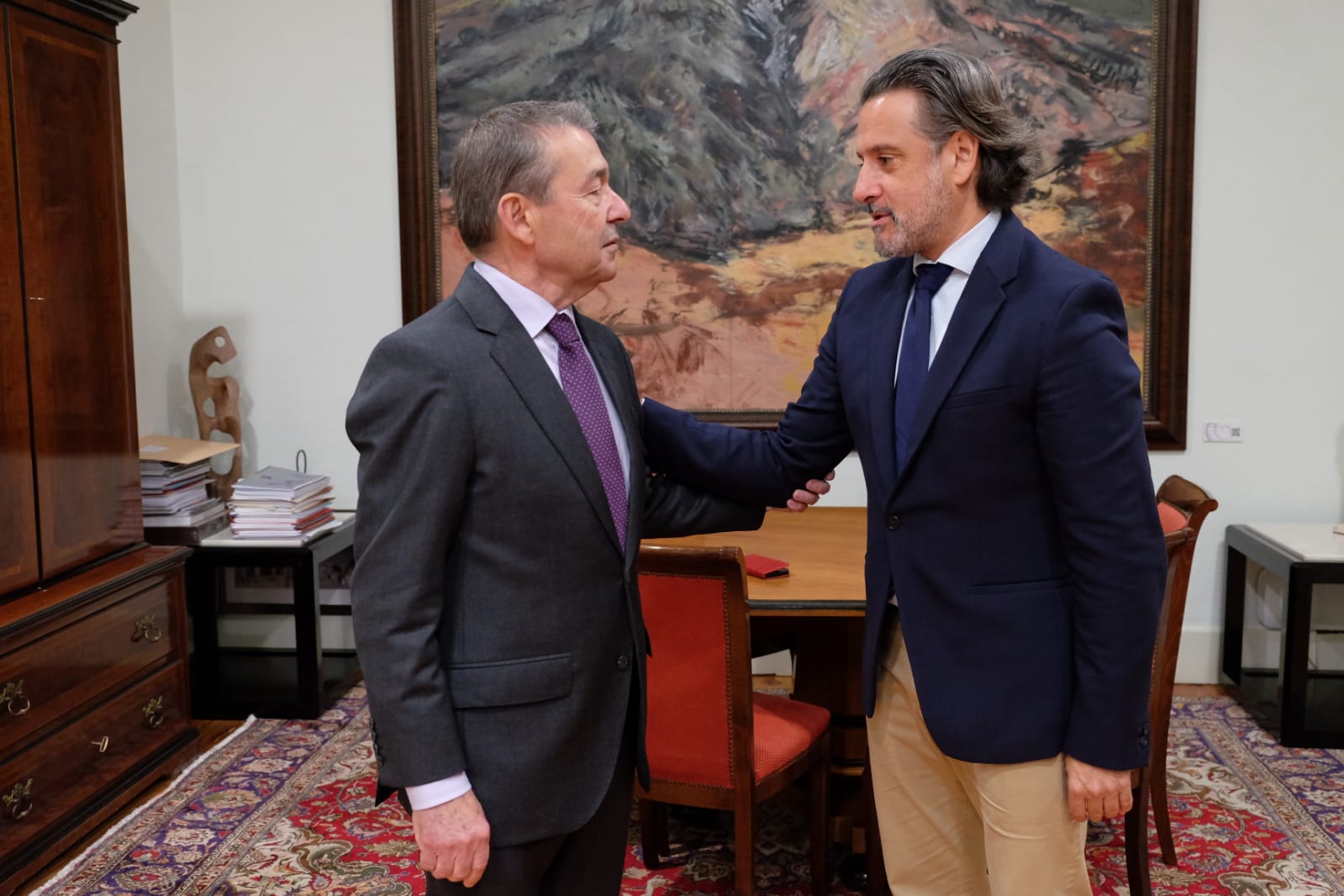 Canarias, 26 de enero de 2023.- El presidente del Parlamento de Canarias, Gustavo Matos, recibió este jueves al presidente del Club Deportivo Tenerife, Paulino Rivero. Matos trasmitió su enhorabuena a Rivero, vigésimo segundo dirigente de la formación blanquiazul, deseándole los mayores éxitos al frente de la entidad. Durante la visita, trataron temas concernientes a las líneas de trabajo marcadas para el próximo cuatrienio (2022-2026), centradas en una estrategia de refuerzo de la cantera del equipo. El expresidente de Canarias (2007-2015), que tomó posesión del cargo el pasado diciembre, sucede a Miguel Concepción en la presidencia del club.