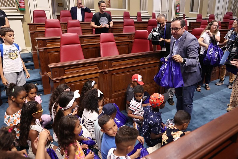 El Parlamento de Canarias acogió este jueves 11 de julio la visita de los niños y niñas saharauis que participan este verano en el programa solidario Vacaciones en Paz, organizado por la Asociación Canaria de Amistad con el Pueblo Saharaui. Se trata de una treintena de los menores que vive durante el resto del año en campamentos de refugiados en las proximidades de la ciudad argelina de Tindouf, una de las zonas más inhóspitas del desierto del Sahara. Gracias a la solidaridad de numerosas familias canarias, estos niños y niñas pueden alejarse durante los meses de verano de la condiciones climatológicas extremas que sufren en esta zona del Sáhara, donde las próximas semanas alcanzan hasta los 60 grados de temperatura. Los menores, acompañados de las familias, se reunieron hoy en el hemiciclo, donde fueron recibidos por la vicepresidenta primera de la Cámara, Ana Oramas, y la Secretaria Segunda de la Mesa, Patricia Hernández. Tras la bienvenida de la vicepresidenta, el delegado de la Asociación Canaria de Amistad con el Pueblo Saharaui, Alberto Martin Barroso, agradeció la acogida de las familias canarias que cada año participaban en esta iniciativa que lleva cuatro décadas realizándose. El evento contó con la asistencia de algunos diputados y diputadas como José Miguel Barragán, Natalia Santana, Jonathan Martín y el viceconsejero de Relaciones Institucionales con el Parlamento, Víctor Chinea.