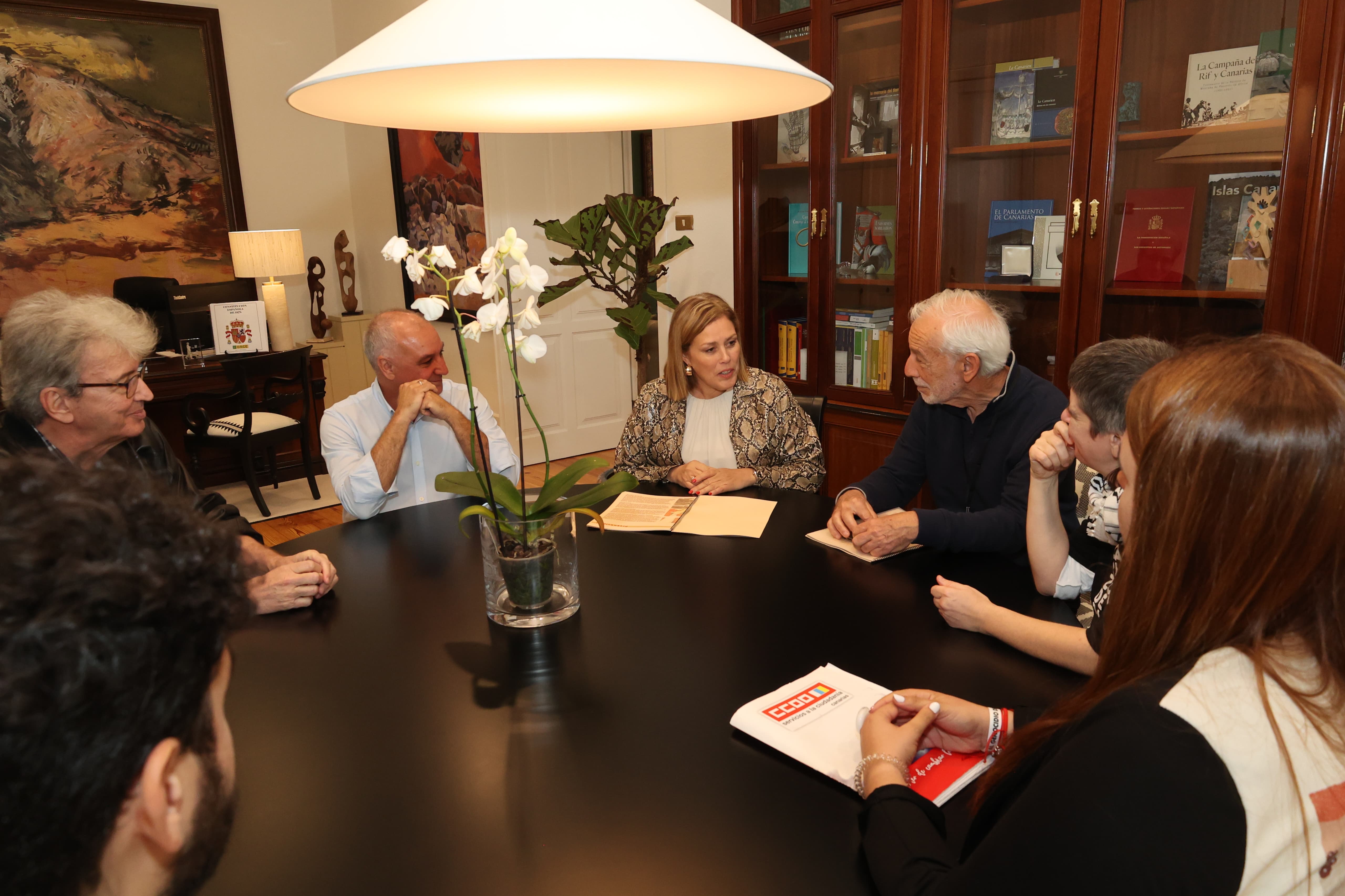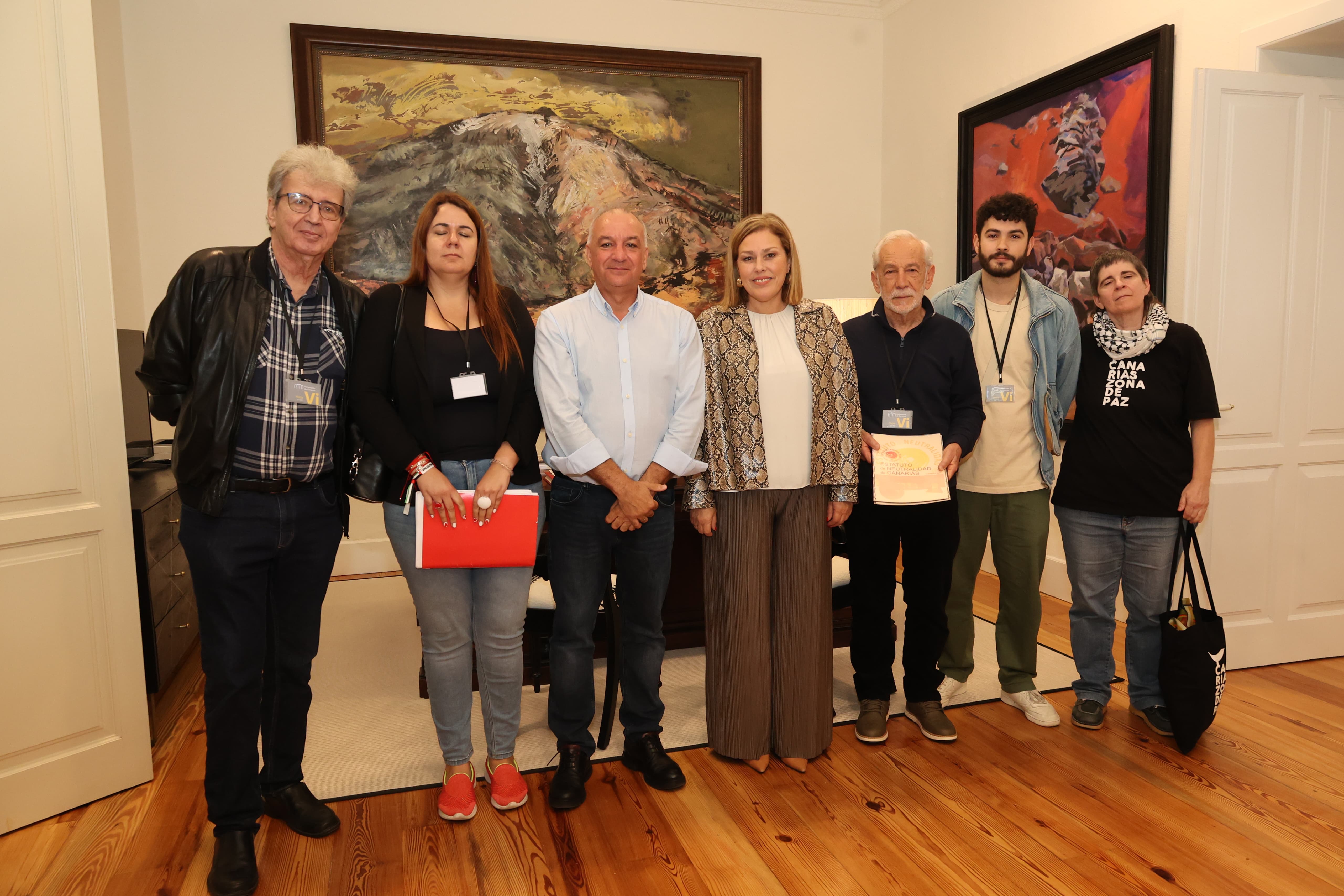 Este miércoles, la presidenta de la Cámara ha recibido la propuesta del Estatuto de Neutralidad para Canarias por parte de la Comisión Promotora de dicho documento. Una propuesta que consta de siete artículos con medidas como la de declarar al archipiélago como territorio desmilitarizado y neutral en caso de conflicto bélico armado. “Se trata de un documento muy interesante, promovido por una treintena de colectivos sociales, políticos y sindicales”, señaló la presidenta durante la reunión. Tras el encuentro, en el que estuvo presente el diputado del GP NC-BC, Luis Campos, los representantes de la comisión atendieron a los medios de comunicación en la Sala Europa.