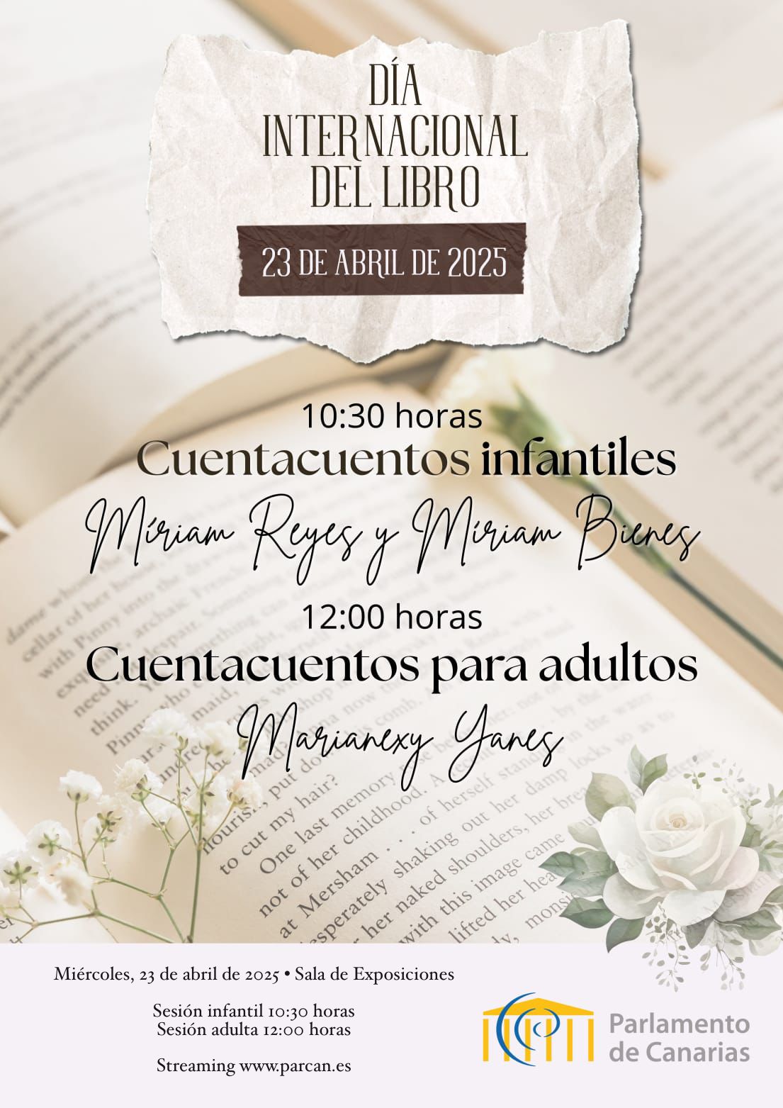 Este miércoles, Día Internacional del Libro, el Parlamento canario conmemora esta jornada con dos sesiones de cuentacuentos para grandes y pequeños. A las 10:30 horas, tras la inauguración por parte de la presidenta de la Cámara, Astrid Pérez, dará comienzo la parte infantil con taller de teatro y actividades para fomentar la lectura. Y a partir de las 12:00 horas, cuentacuentos para adultos.